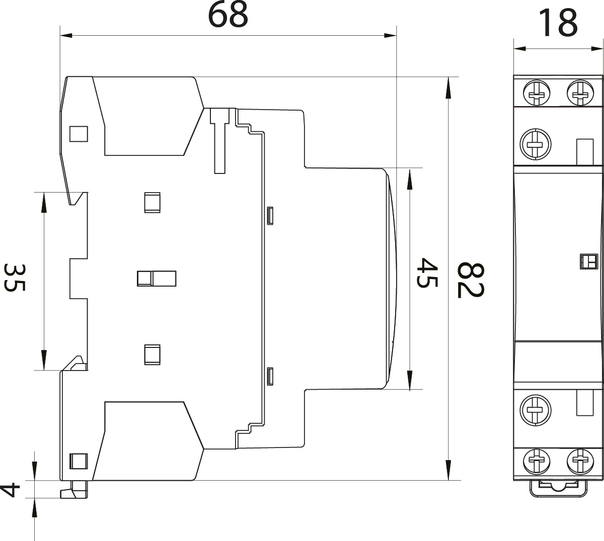 Rysunek Techniczny - Stycznik modułowy SM25A/2NO/1P, 25A, styki 2xNO (normalnie otwarte), cewka 230V, 1-modułowy