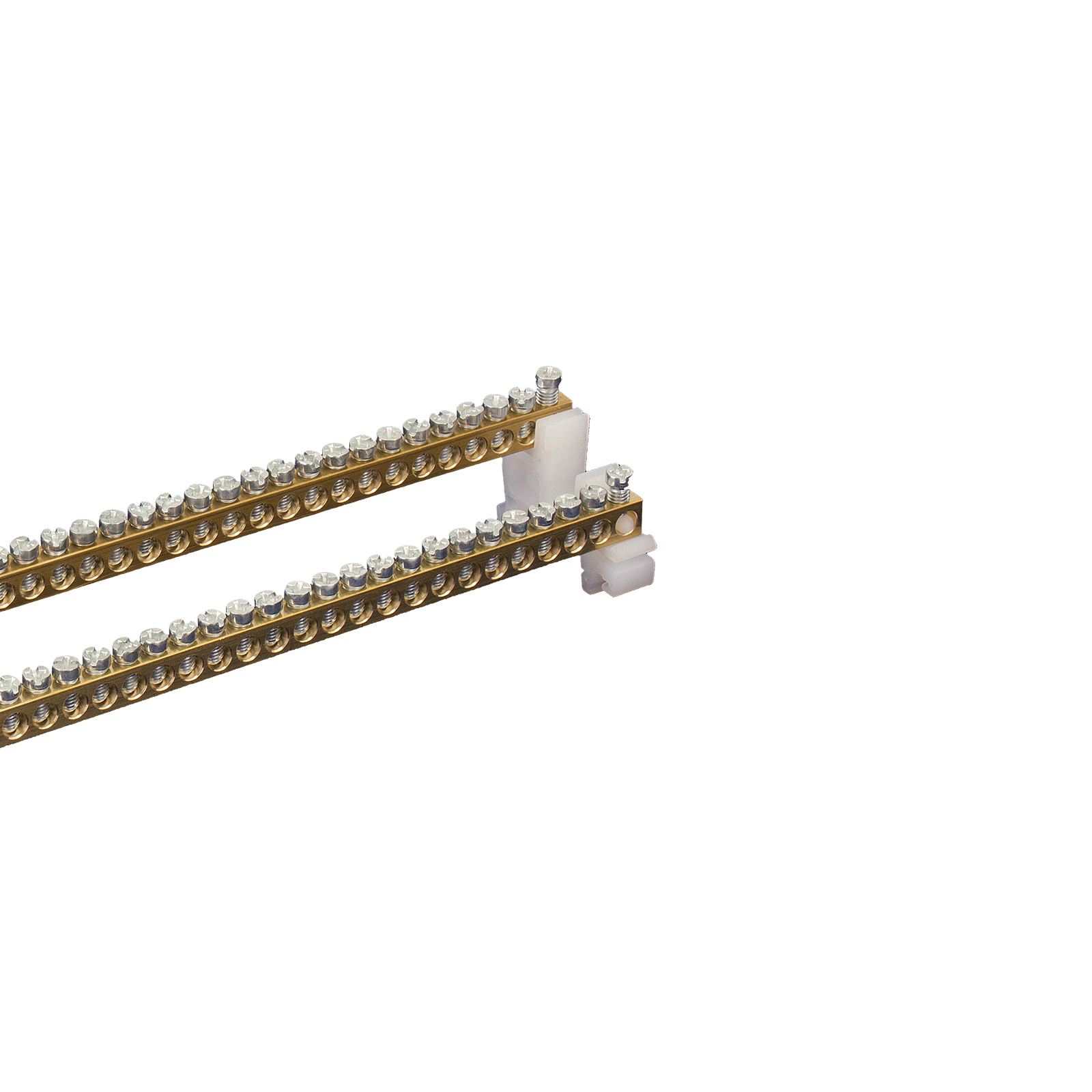 Protective terminals are used as a connecting element for protective PE and neutral N copper wires in device, which are mounted among others in distribution boxes, switchboards and control panels or control desks. Protective terminals are equipped with holes, with clamping screw for electric wires, in which is embedded the isolated cable end.