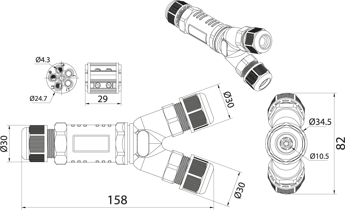 - Cable Connector SPNTY 353, 3P, 3x1.5-4.0, 250V, 24A, IP68