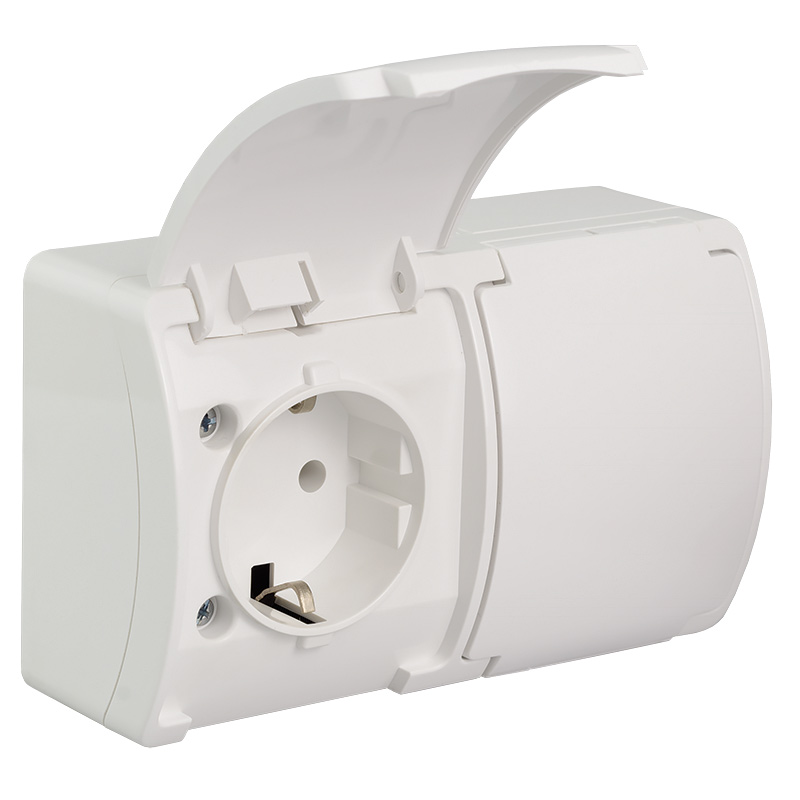 • Double Socket (Schuko 2x2P+Z) VG-2S, with Schuko type earthing contact, screw type terminals, IP44,elektro-plast