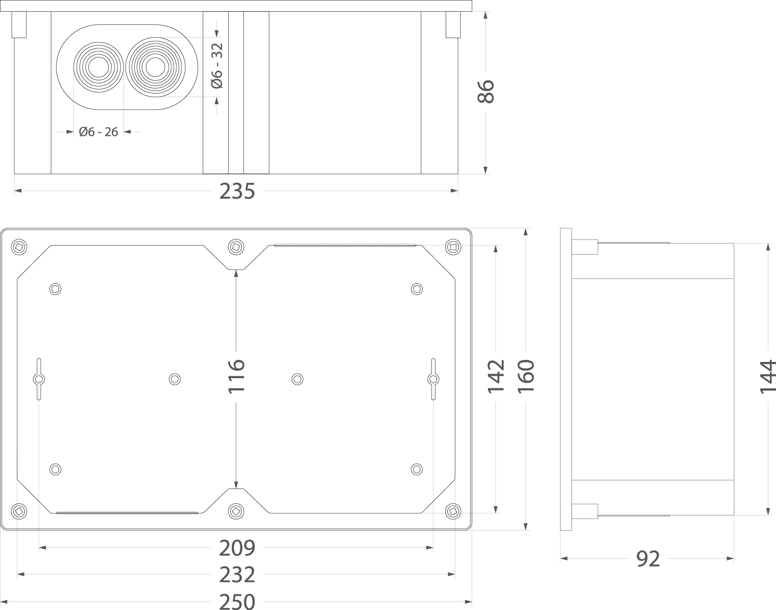 Rysunek Techniczny - Hermetic flush-mounted facade box Ppt-EH250 INOX, IK10, IP65, stainless steel cover, 160x250x92
